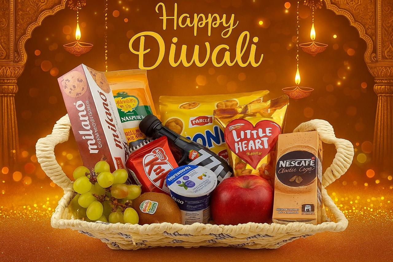 Bring in the festivities with this mini gift basket full of your favourite snack, munchies and more. Express gratitude, affection and care for your sibling with these sweet goodies. This basket includes: Grapes 200g,Zespri kiwi gold 1 pc,Apple washington 1 Pc,Kitkat 30g,Epigamia yogurt,Appy fizz 250 ml,Little hearts 34.5g,Nescafe chilled latte,Monaco - Classic Regular,Milano - Chocolate Chip Cookies,Dhampur's Gur Chana 150g,Act II
